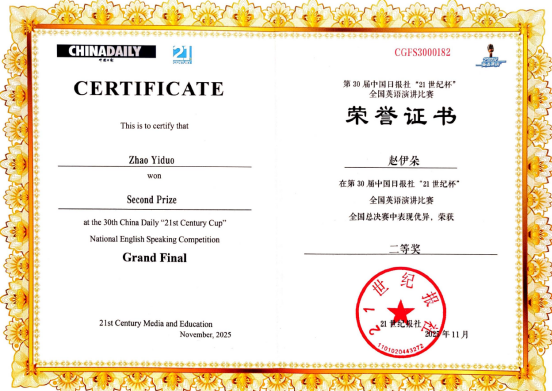 2022级商务英语专业学生赵伊朵(指导教师:张巍),凭借扎实的语言功底与出色临场表现,荣获全国总决赛二等奖。