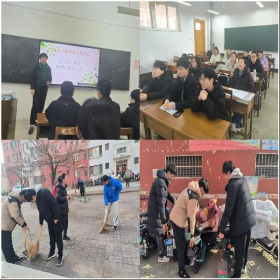 分工会组织学生志愿者开展以“践行雷锋精神、共建文明校园”为主题的爱护校园环境活动,集中整理校园电动车停放秩序并进行卫生清扫活动。